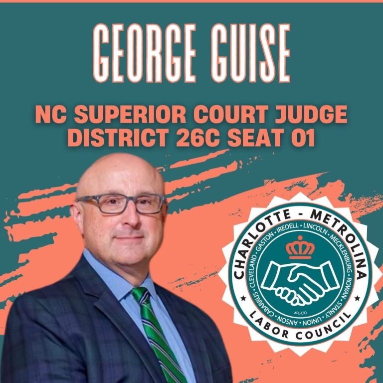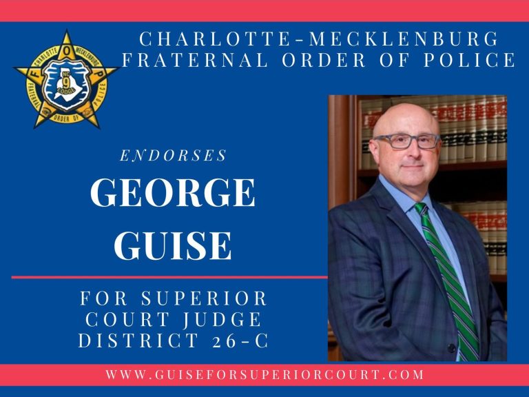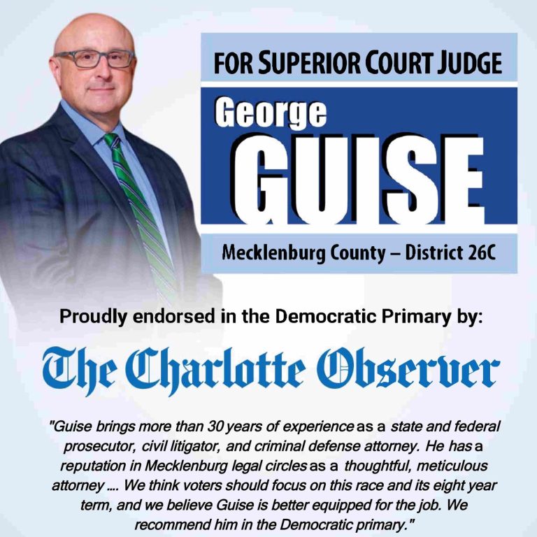 “I am proud to support George Guise to be our next Superior Court Judge from District 26C. George's unparalleled experience as a state and federal prosecutor, and as a civil litigator and criminal defense attorney, speaks directly to his understanding of the law and the kinds of cases he'll preside over. His experience in the community on behalf of the citizens of Mecklenburg County speaks even more to his commitment to justice. I've known George's reputation for integrity and fairness for many years now, and I know he will serve us all well on the bench."
